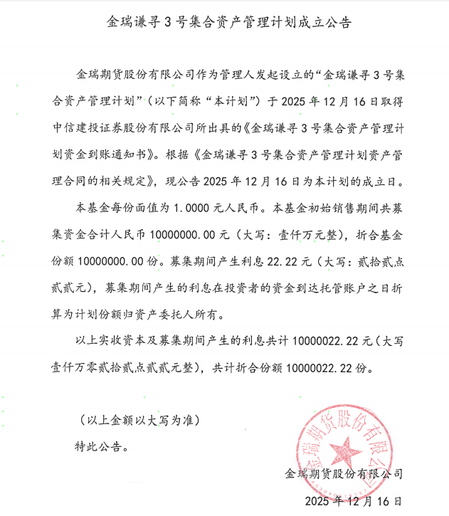金瑞谦寻3号集合资产管理计划成立公告