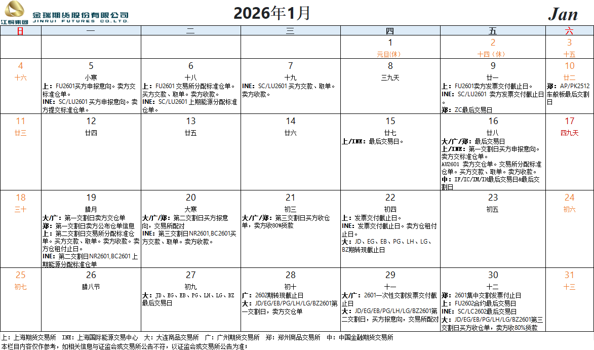 交割日历(2026年1月)